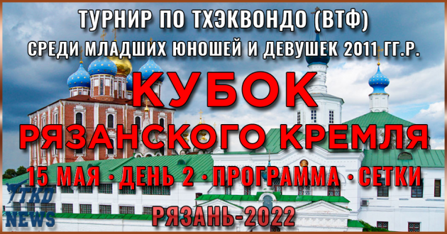 15 Мая в Рязани, на турнире по тхэквондо ВТФ для младших юношей и девушек 2011 года рождения "Кубок Рязанского Кремля," пройдут поединки среди младших девушек. Начало соревнований в 9:00 по Москве. Сетки второго дня ...